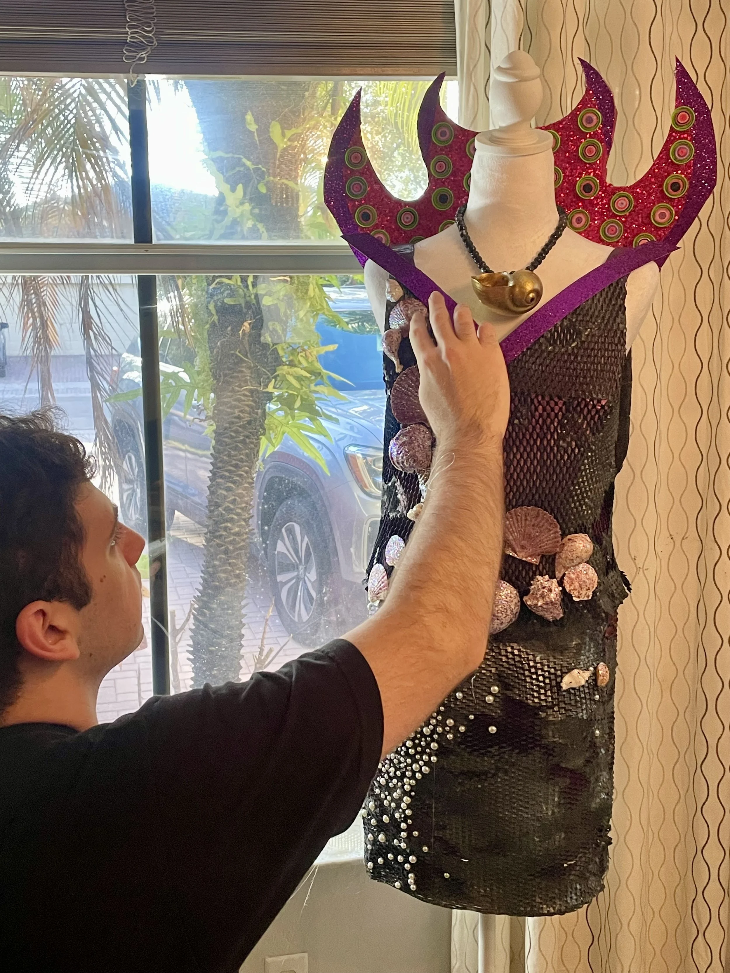 The concept of this project was to create my award winning Ursula design out of found materials. I used cardboard, paper, plastic, and other found items to create this sustainable and fully functional design.