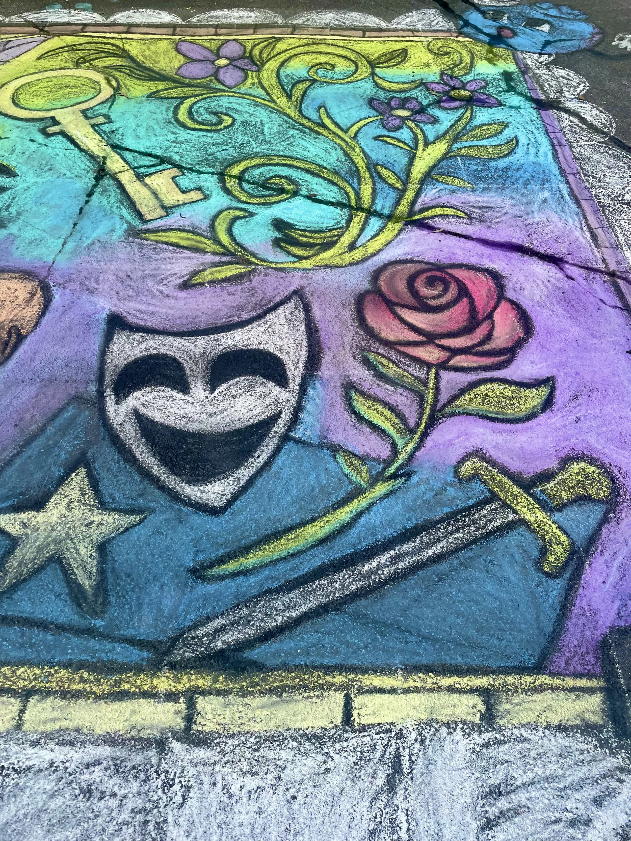At Interlochen’s annual Collage event, our cohort worked as a team to create a large-scale chalk mural using a grid enlargement process. We measured and mapped the pavement together, then each student designed a section that connected seamlessly into the whole. I was responsible for a section featuring a rose, theatrical mask, sword, and key which are symbols of storytelling and creativity. I used chalk layering and blending techniques that brought depth and vibrancy to the design. This project showed me how collaboration can support creating something far greater than any one person could achieve alone. It truly was a memorable experience.