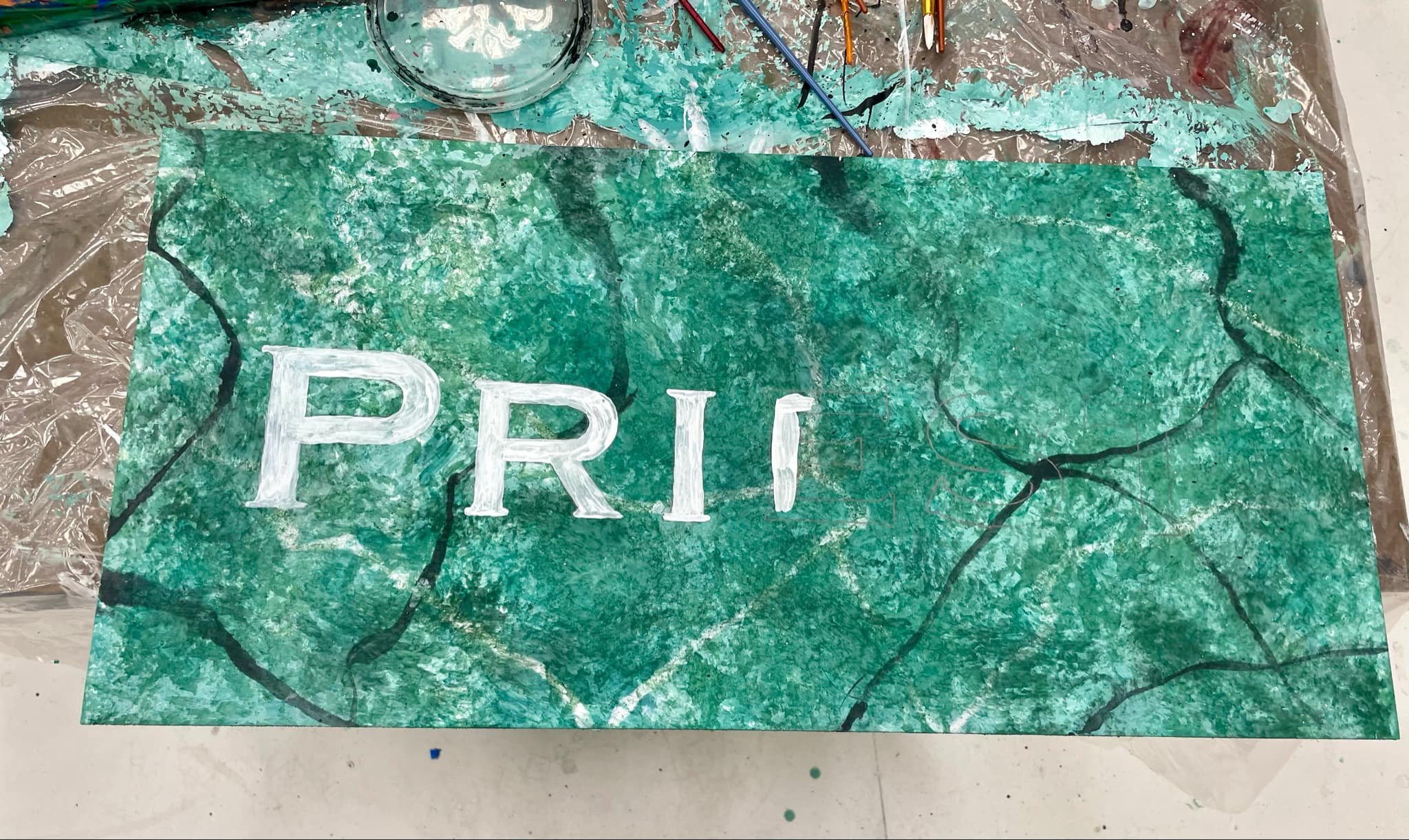 When that layer was complete, I used a ruler to trace my last name and painted inside the letters. The clean, structured lines stand out against the marbled background, balancing precision with creativity. The technique gives the board a realistic stone effect that’s perfect for scenic painting and set design applications.
