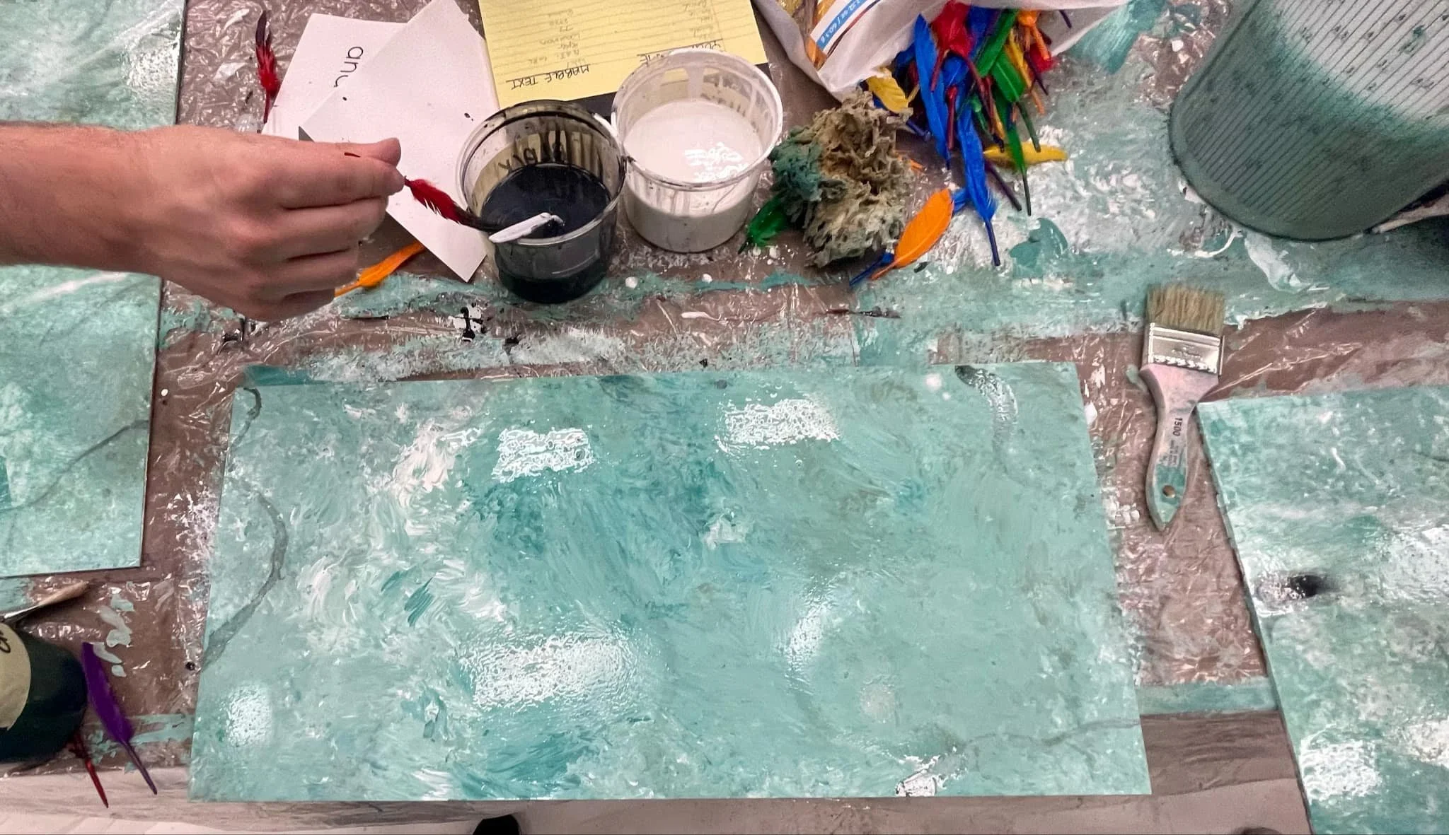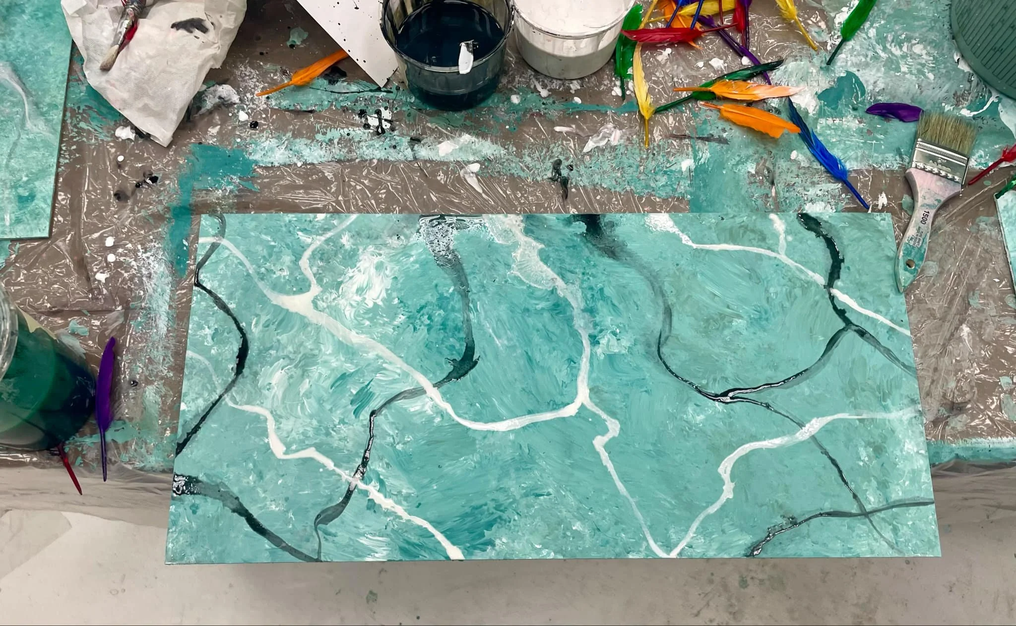 This piece explores texture and movement through layered color and mixed media. I started by covering the board with shades of green, white, gray, and black, using a sea sponge to build soft, layered textures. Once it dried, I dipped a feather in white, gray, and black paint and gently dragged it across the surface, creating natural veins that resemble real marble.