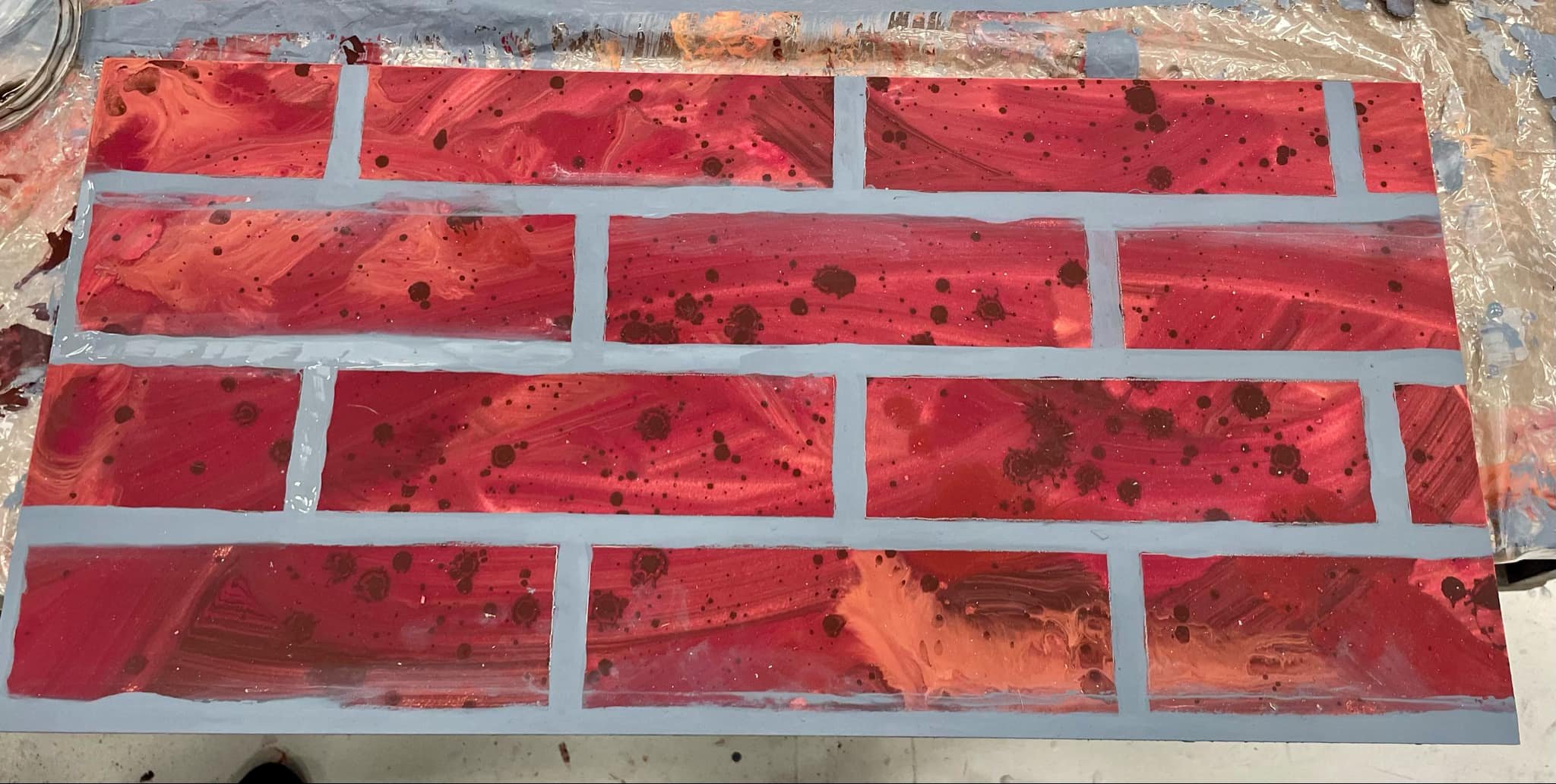 I created a realistic brick effect by layering vibrant shades of red, orange, and yellow paint across a board using a large flat brush to mimic the natural color variations found in real masonry. Once the base was completely dry, I carefully used a ruler to outline the individual bricks, ensuring uniform spacing and proportion. To complete the look, I painted the mortar lines between each brick with white paint and a medium-sized brush, bringing contrast and dimension. The finished piece closely resembles an authentic brick wall which is an ideal technique for scenic design and set painting.